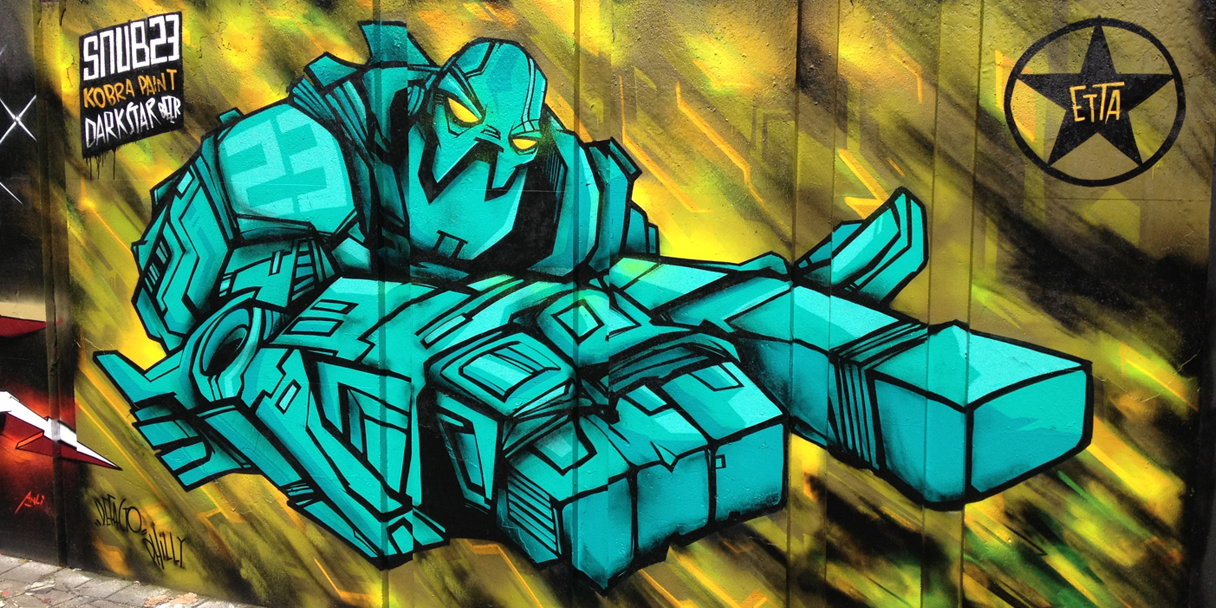 Since starting out in the 1990s, legendary street artist SNUB has become known for his futuristic murals, inspired by fictional robot Hammerstein. Towering images of Hammerstein and fellow non-violent robotic protectors have sprung up in public spaces from Shenzhen in China to Eindhoven in Holland, symbolising the artist’s guarded approach toward his life and work.