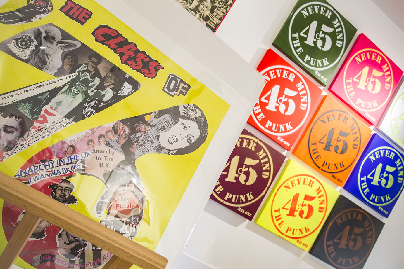 In Never Mind the Punk 45, Mal-One uses the original 7” artworks alongside snippets of related material to show the bands back story. From press cuttings, to tickets and promo badges, the show encapsulates the vibrant subculture.